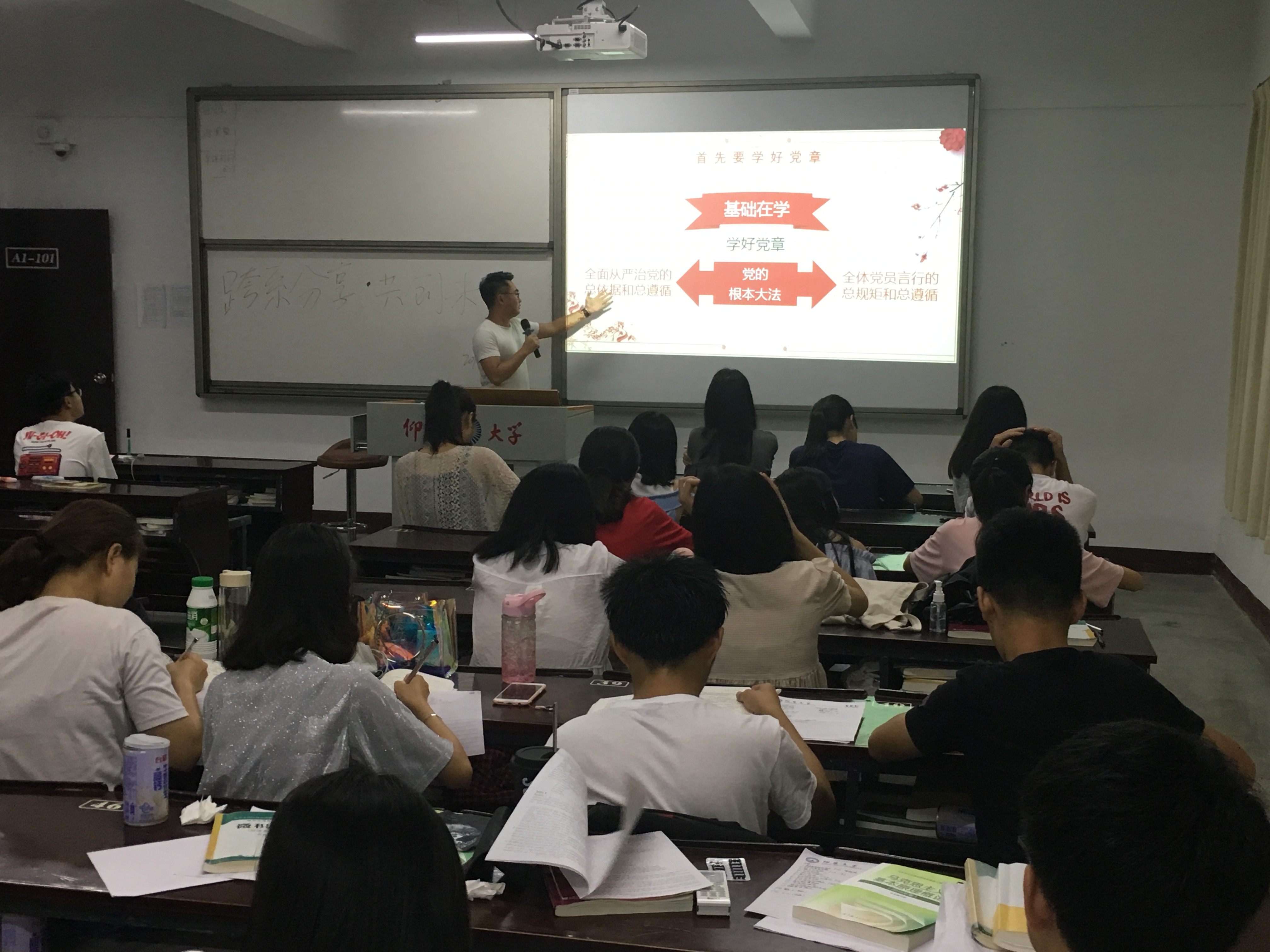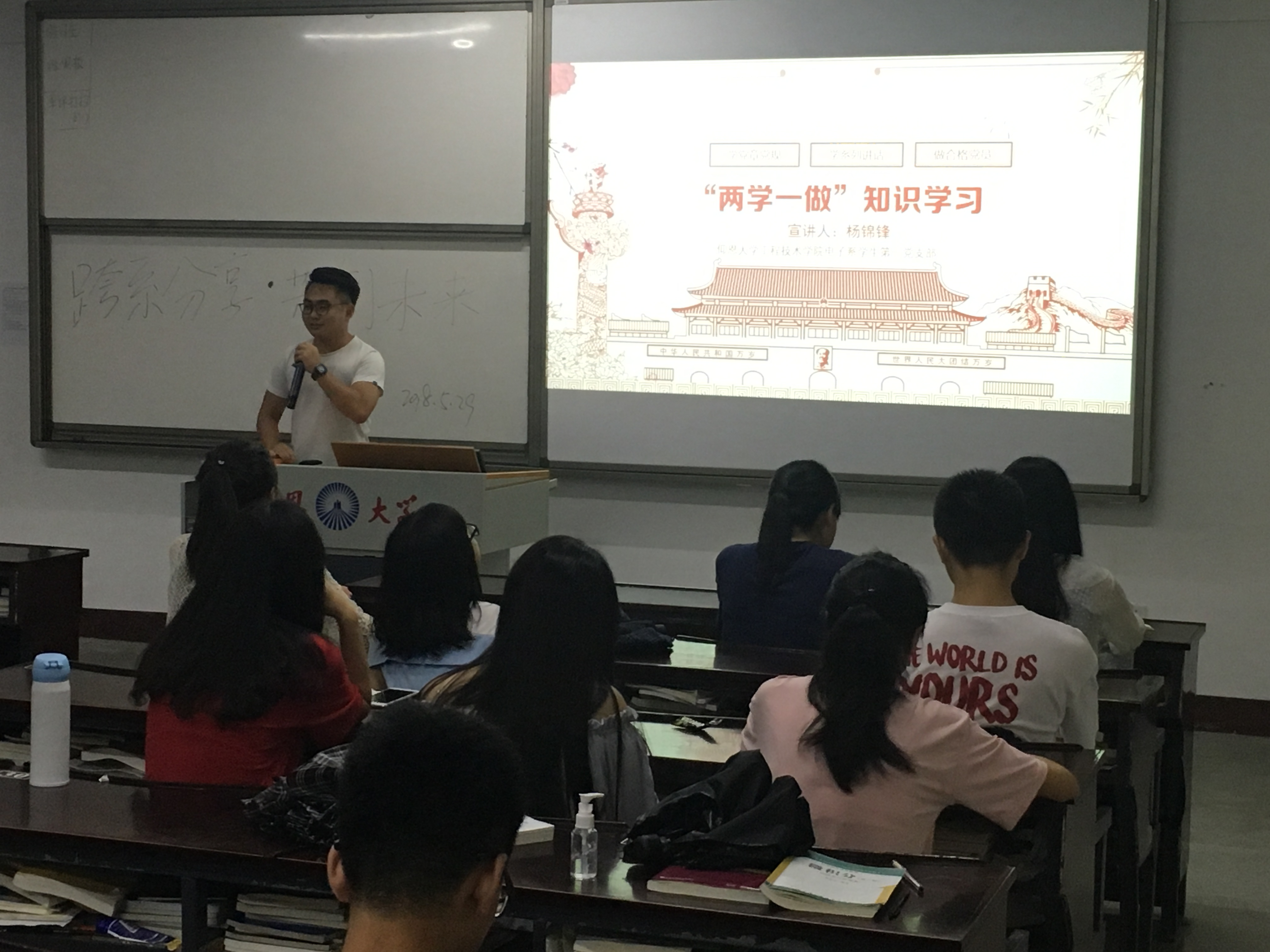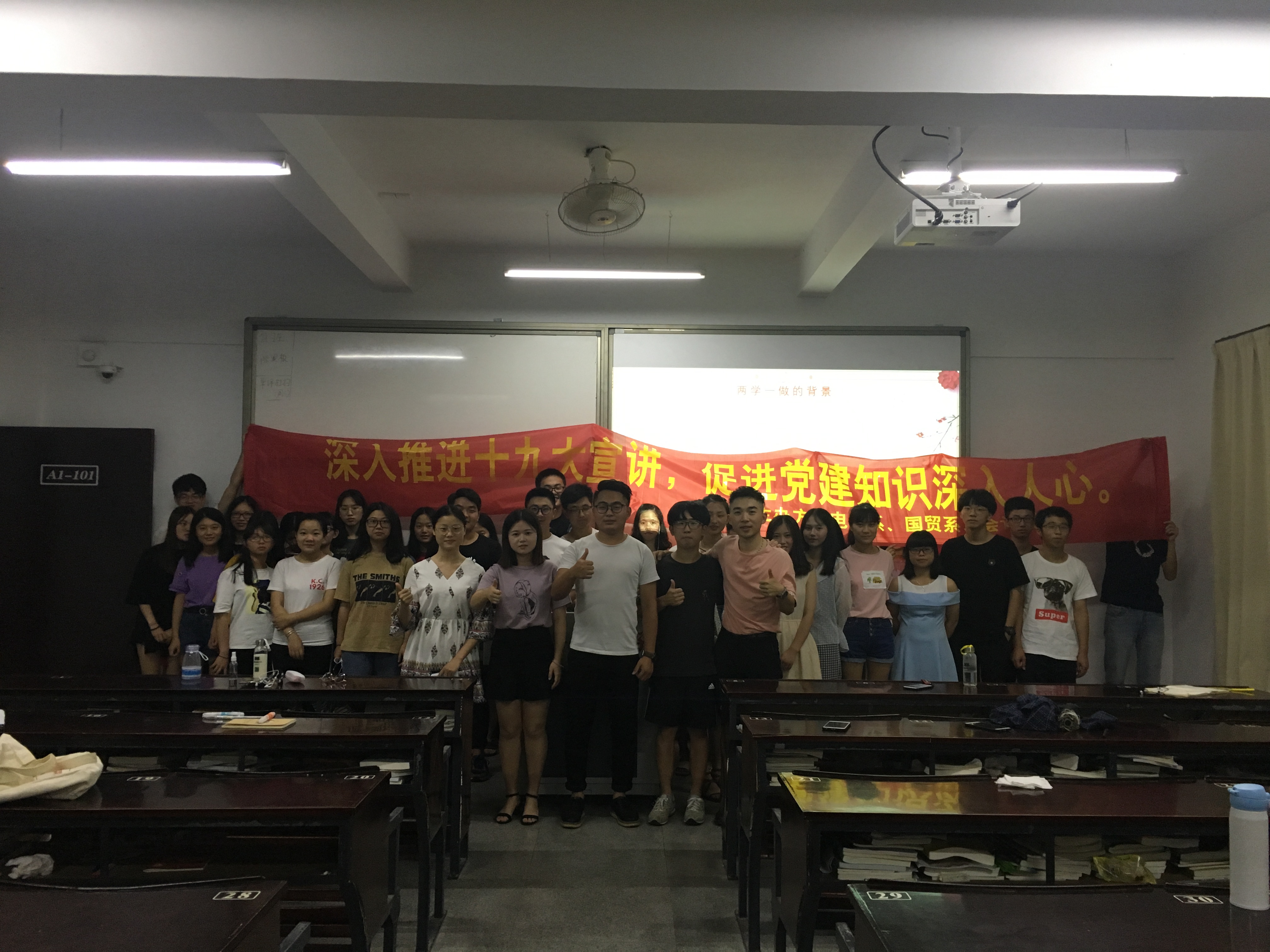 根据学院党总支要求各支部进行党支部立项活动,电子系学生第一党支部与国贸系、会计系一起开展“跨系分享·共创未来”讨论会,三个系支部分别在不同的班级进行宣讲讨论。2018年5月29日晚上beat365中文官方网站电子系学生第一党支部十九大宣讲小队对经济学院国际贸易专业的新生进行了党建知识的宣讲,出席本次活动的有经贸系学生第一党支部书记林晓富老师,三个系的活动负责人,以及经贸系17级全体学生。