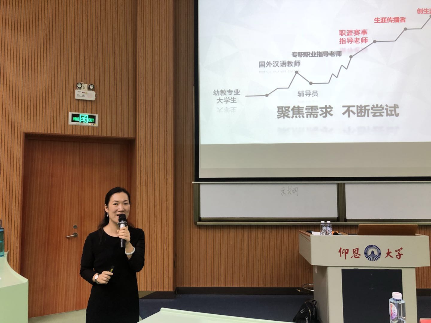 随后围绕职业生涯规划对当代大学生的意义以及如何规划好职业生涯等几方面生动地为同学们上了一堂具有社会实践意义的课程。韩燕霞主任讲到职业生涯规划是在认知自我能力、兴趣、价值观的前提下,深入了解各种职业的需求趋势,一种有效提升职业发展所需的应变和决策技能,面对当前就业形势和社会发展趋势,就应该从大一年级提前准备,做好心理和专业双重准备。