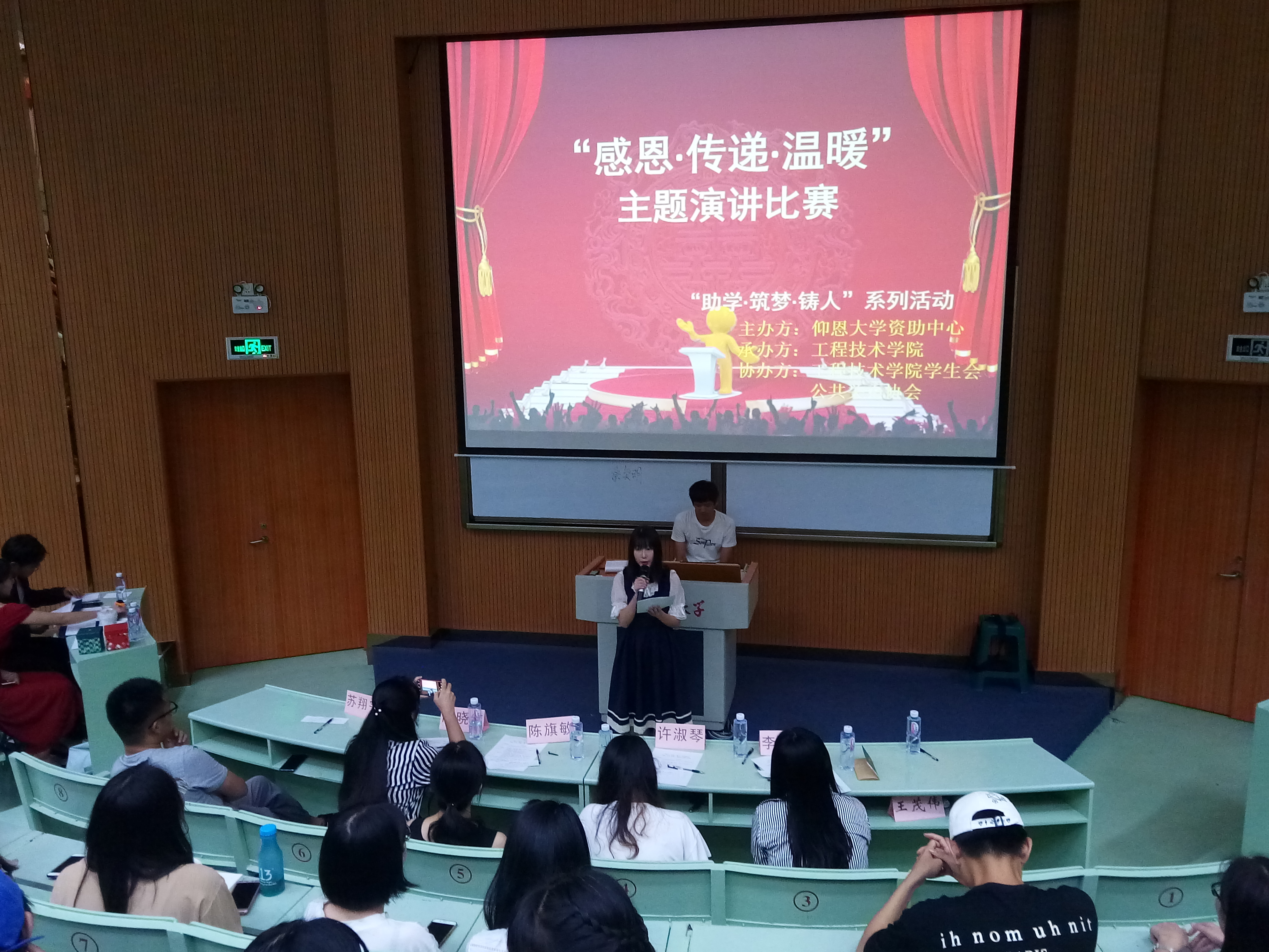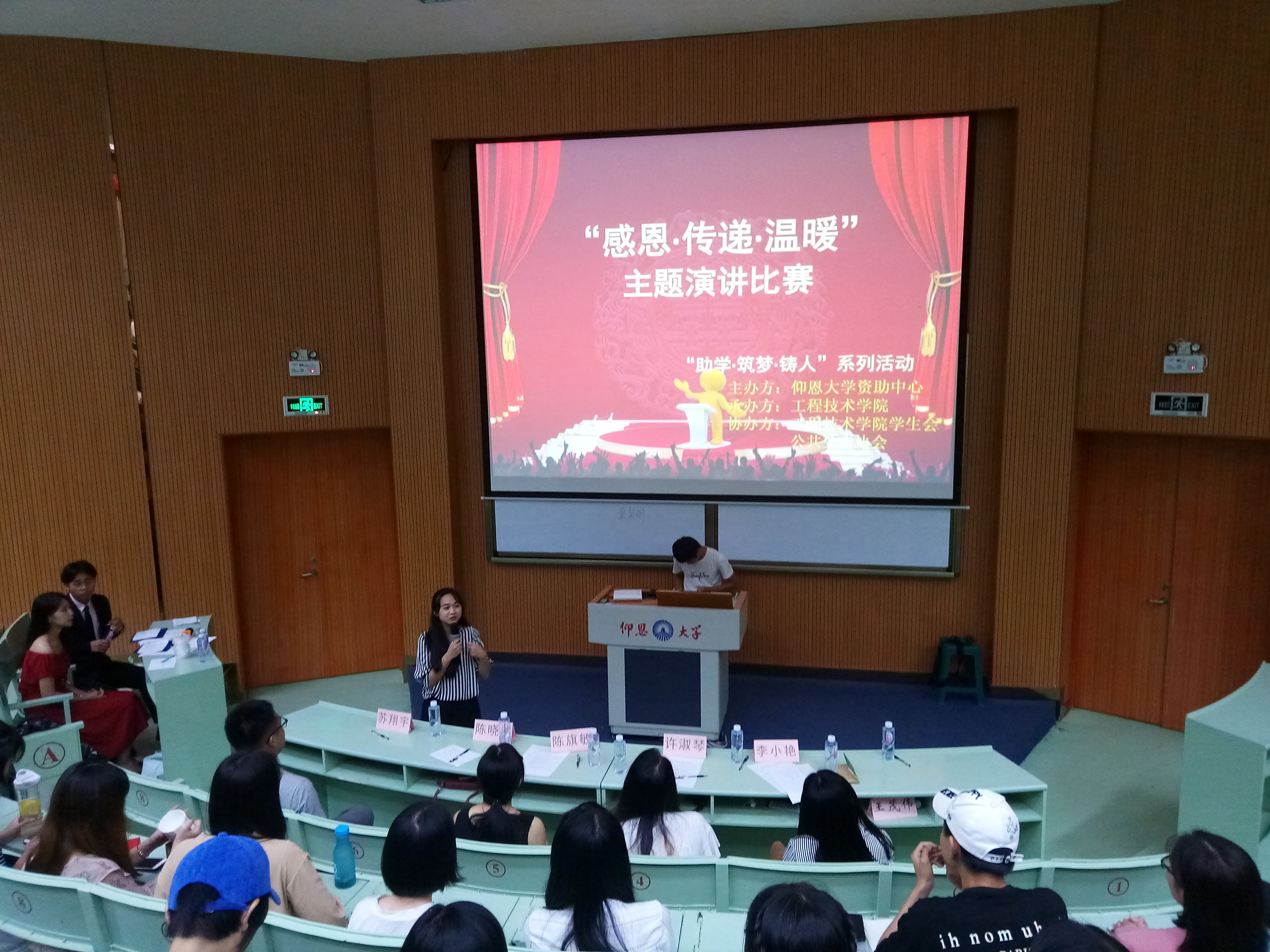 6月6日晚上7点半beat365中文官方网站在旧区和昌乐之讲堂举行了“助学·筑梦· 铸人” 系列演讲活之“感恩.传递.温暖”主题演讲比赛。出席此次活动的嘉宾有学生会指导老师陈晓红、院团委书记许淑琴、学务秘书陈旗敏、教师李小艳。