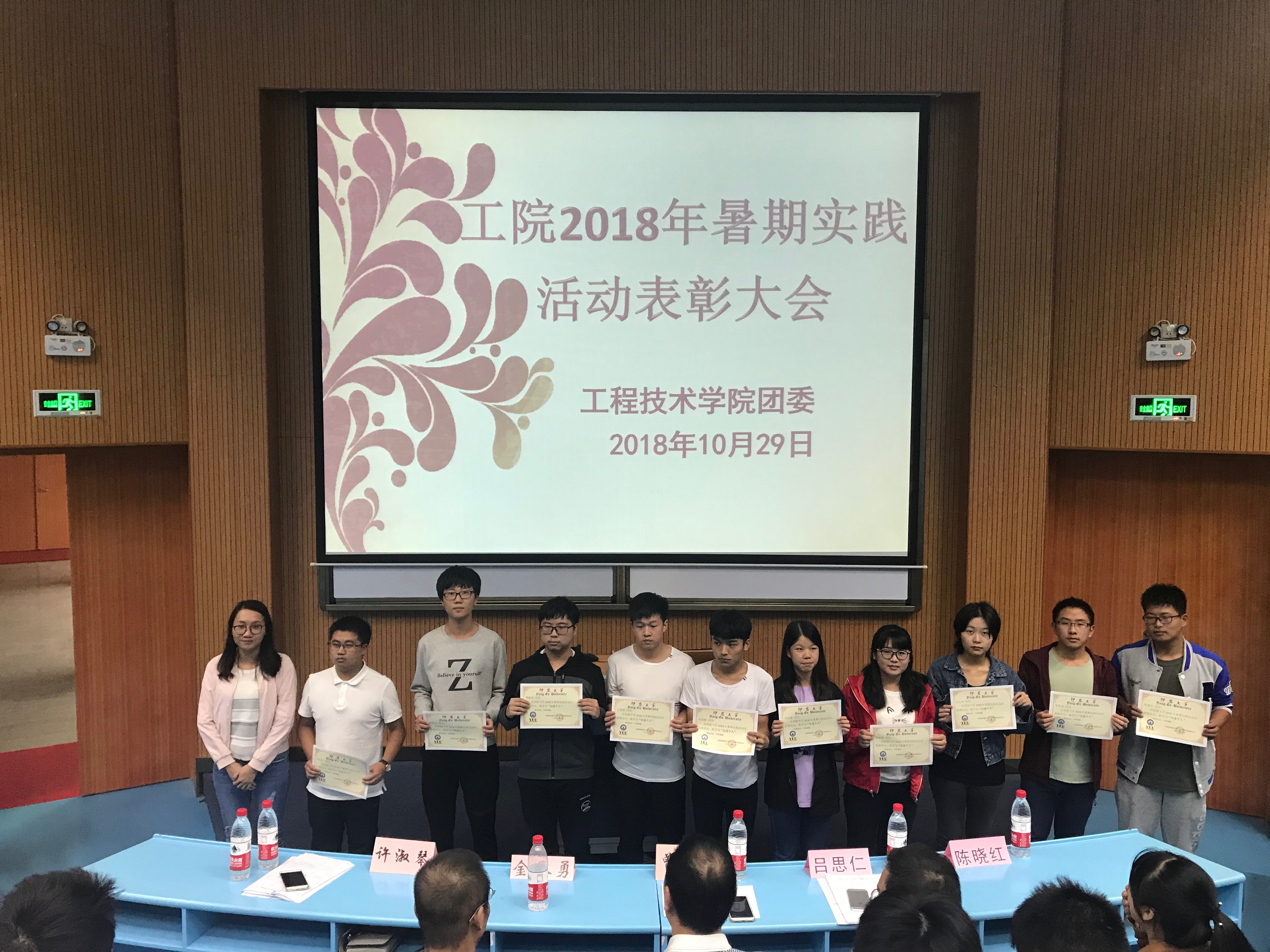 10月29日下午4点,beat365中文官方网站团委在和昌求是讲堂举行beat365中文官方网站2018年暑期实践活动表彰大会,学院党总支书记兼副院长曾凤生老师,学院常务副院长金承勇老师,学院党总支副书记吕思仁老师,学院团委书记许淑琴老师,学院学生会指导老师陈晓红老师,2018年全体工院新生及获奖人员出席本次大会。