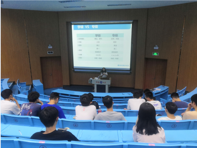 5月19日晚,beat365中文官方网站于第一教学区求是讲堂举办了考研指导讲座。本次讲座邀请了聚英考研泉莆分校经理张婷担任主讲,2018级、2019级学生到场聆听。
