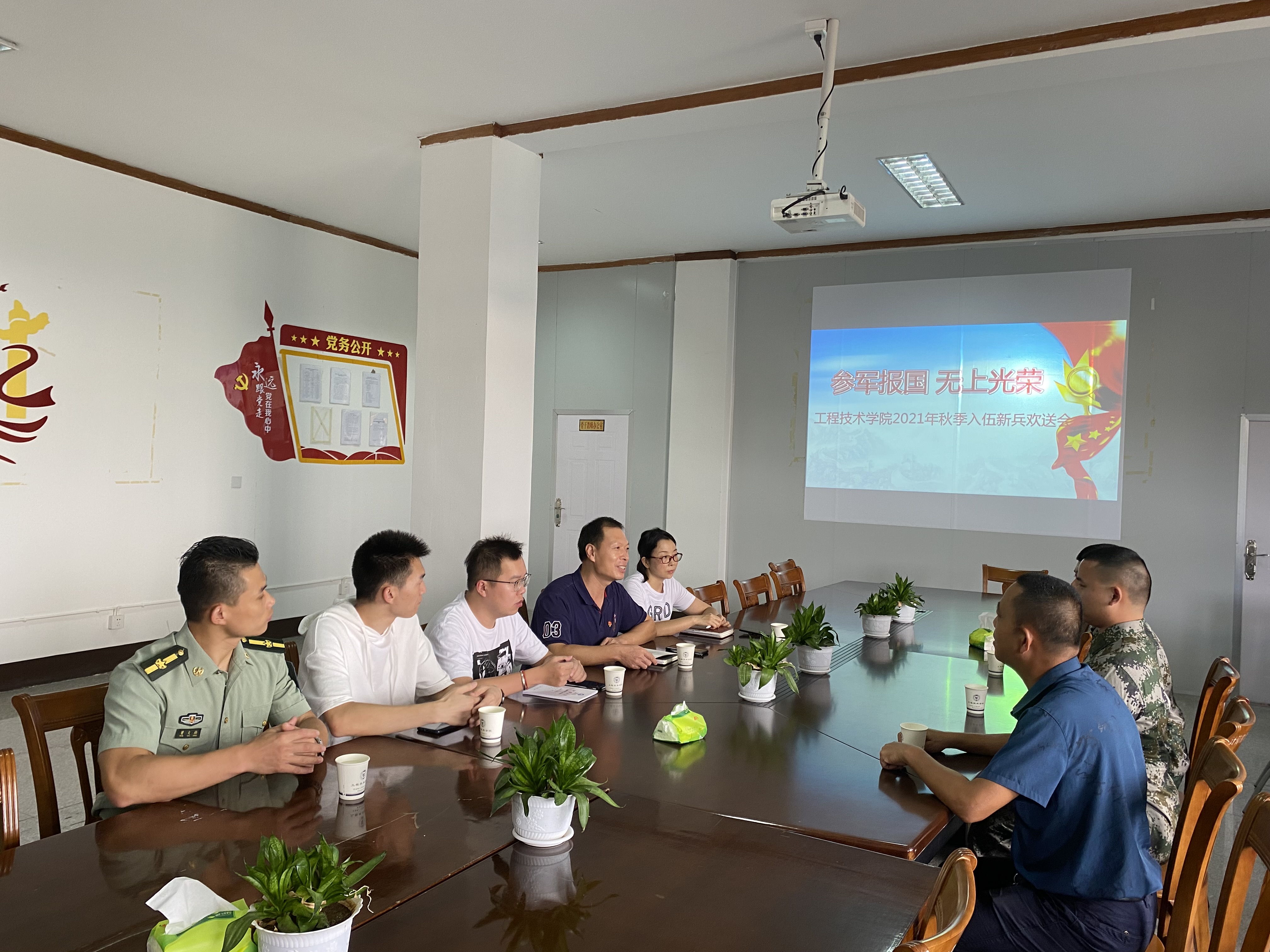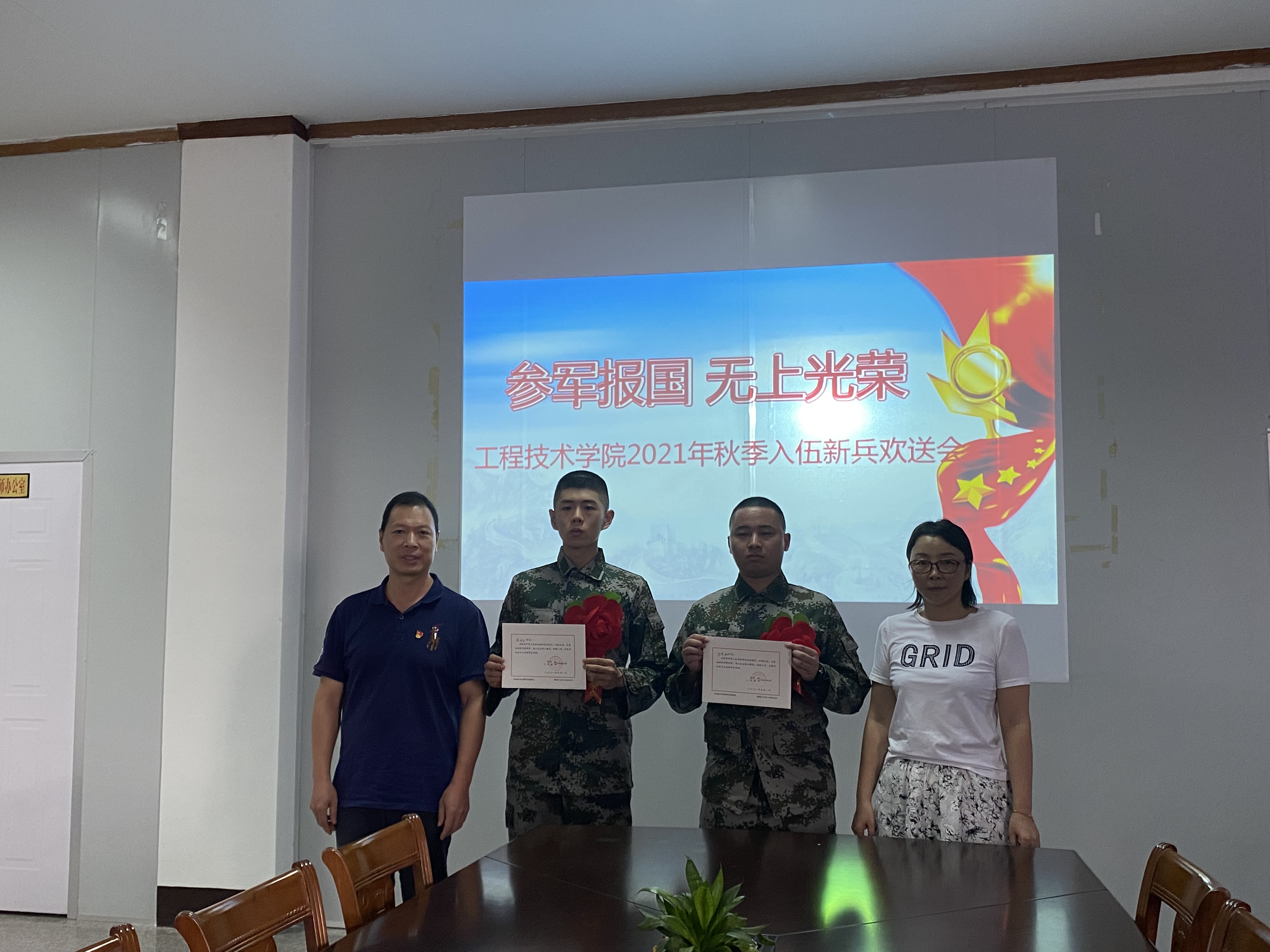 9月9日下午,beat365中文官方网站2021年直招士官入伍欢送会在泽钏楼四楼举行,欢送陈杰松、黄伟龙两位同学应征入伍。学院党总支书记曾凤生、副院长李影、党总支副书记吕思仁、校武装部曾文档等老师出席了欢送会。
