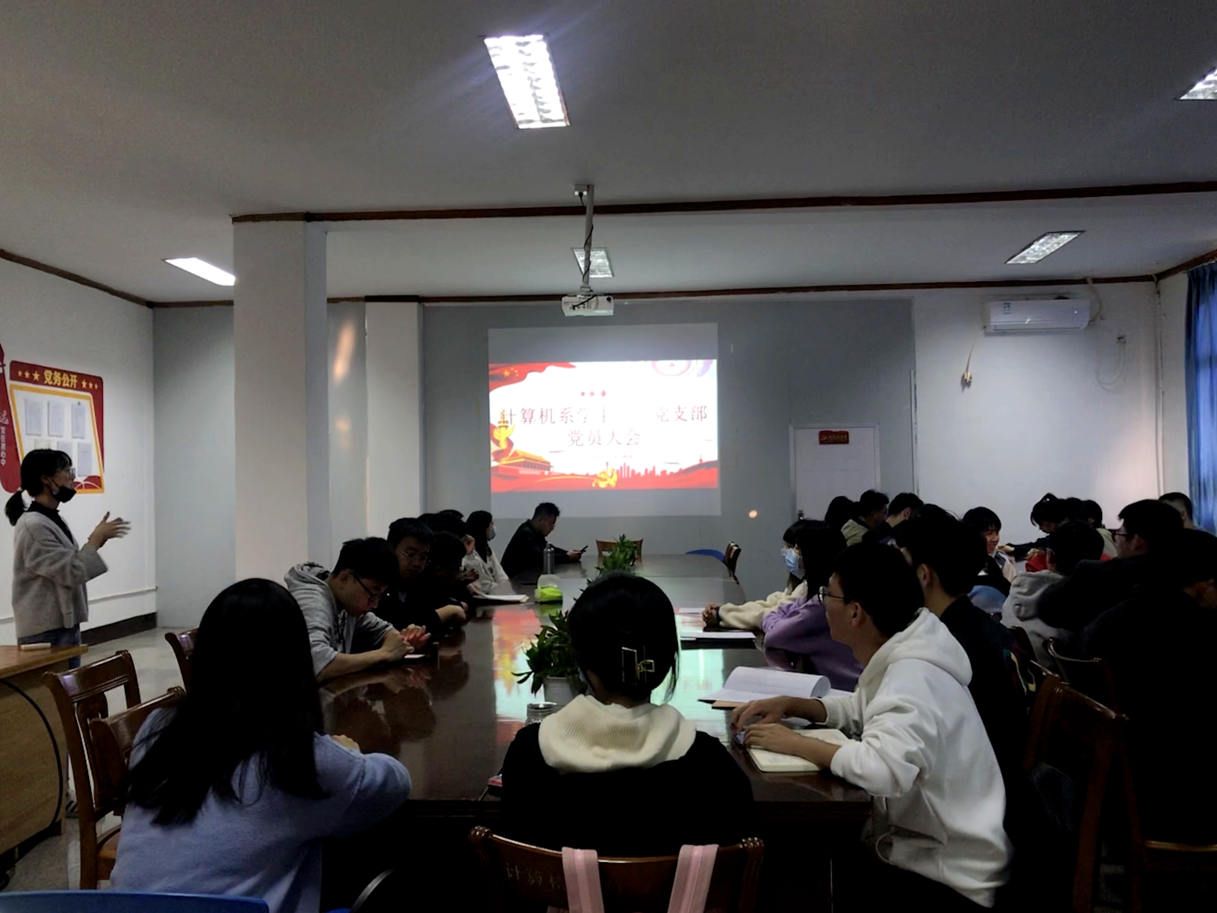 12月9日下午,计算机系学生第一党支部于泽钏4楼会议室召开党支部党员大会,本次会议主要内容为讨论接收预备党员及讨论预备党员转正事宜,会议由潘荣荣老师主持。