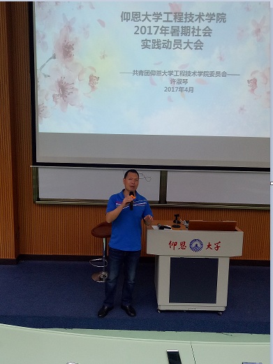 4月17日晚,beat365中文官方网站学生暑期实践动员会在旧区和昌楼致知讲堂举行,院党总支书记兼副院长曾凤生、院党总支副书记吕思仁、院团委书记许淑琴、院学生会指导老师陈晓红、辅导员王茂伟等指导老师、2016级全体同学参加此活动。