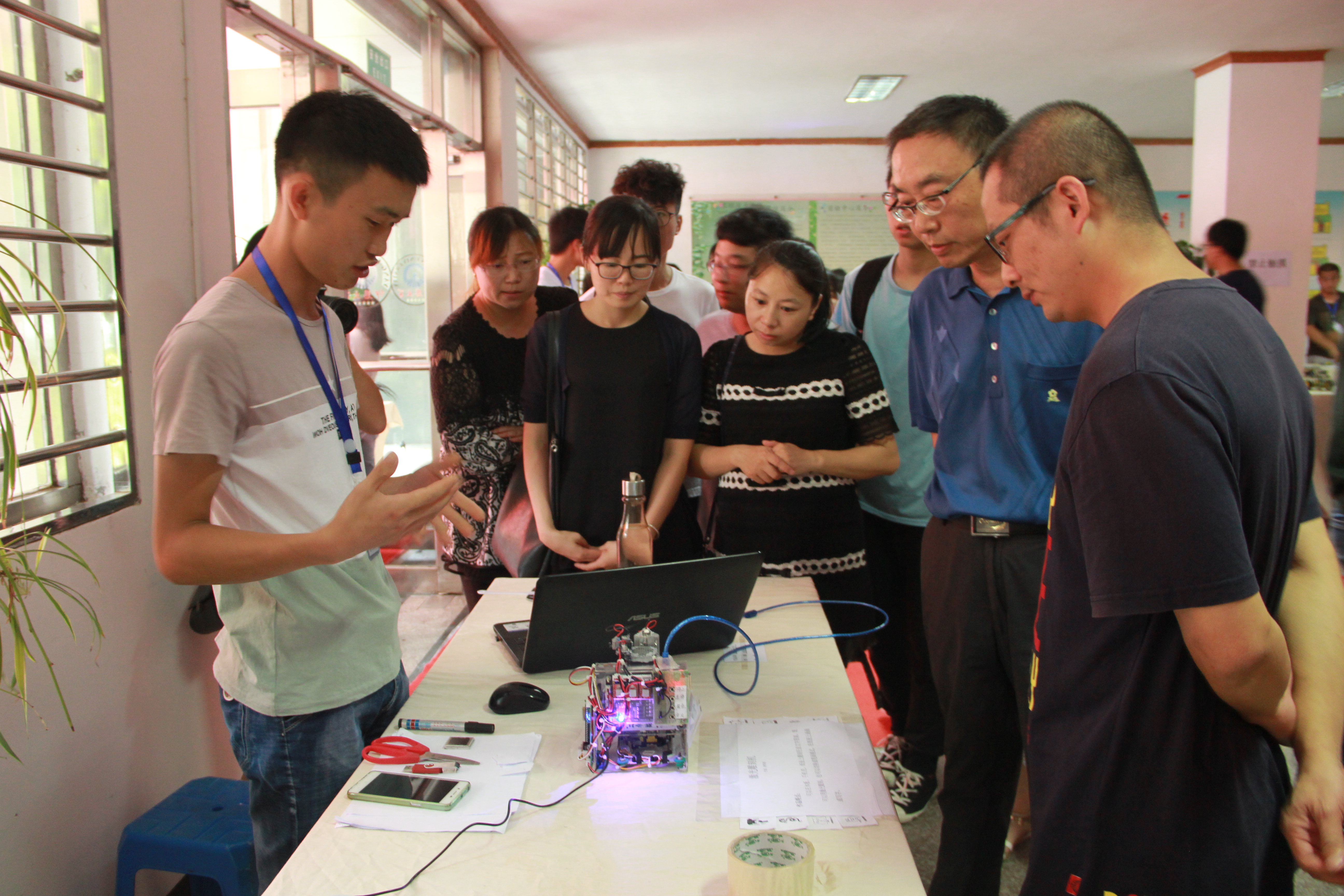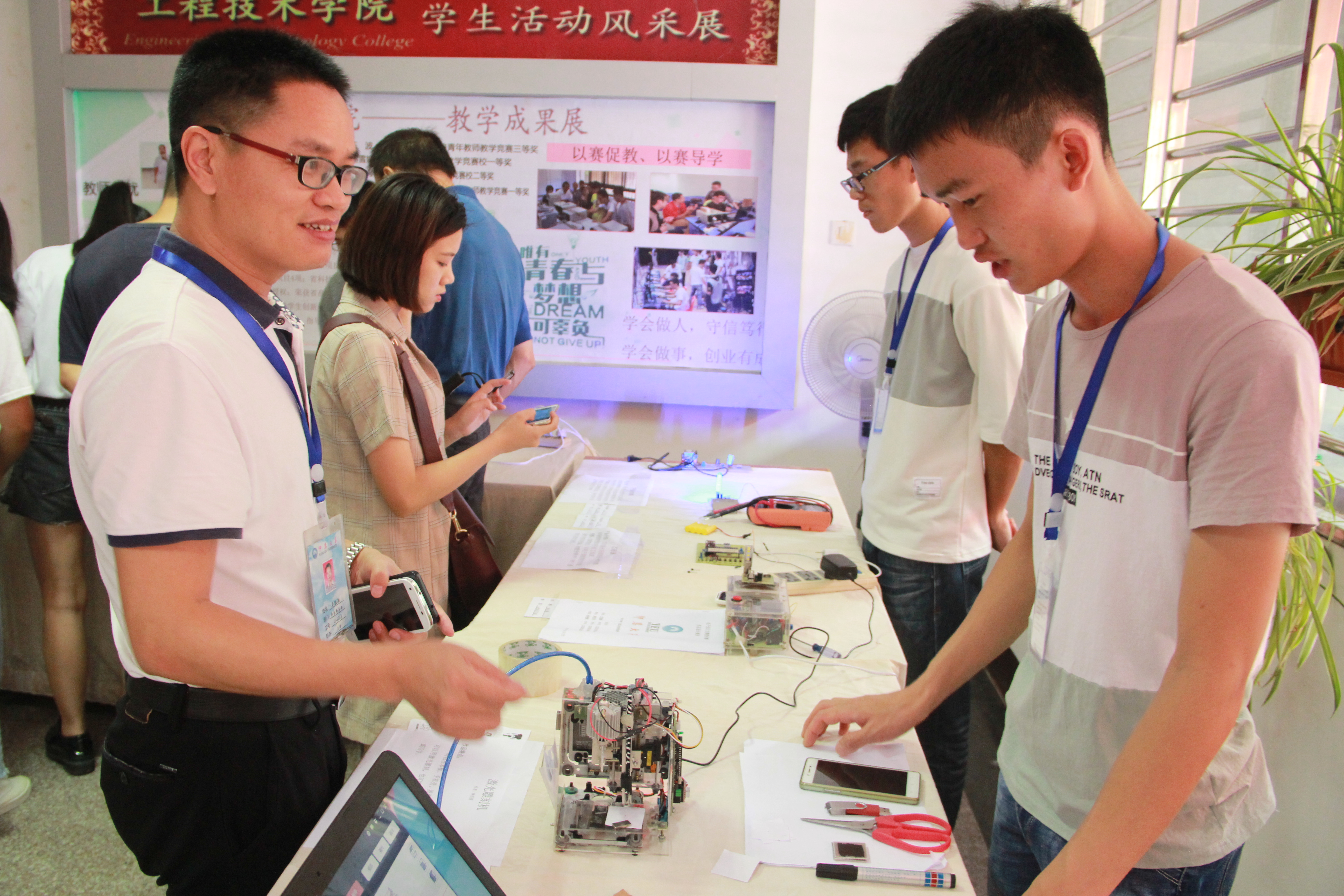 6月14日下午,由beat365中文官方网站主办的第一届创新创意科技作品展在泽钏楼一楼大厅举行。副校长许总,学生事务部主任吴胜潮,beat365中文官方网站常务副院长金承勇、党总支书记兼副院长曾凤生,教务部副主任郑秋莲、赵芳芳等到场并观看作品展。
