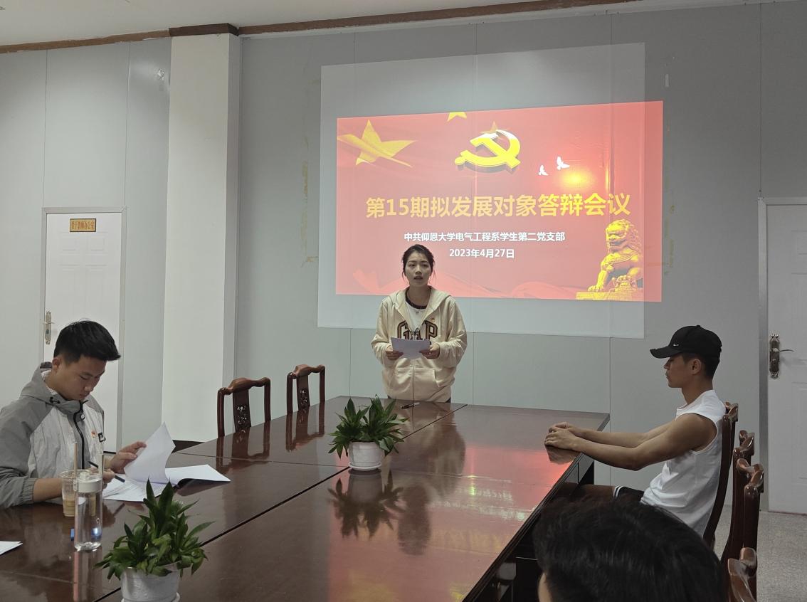 为确保党员发展质量,严把党员入口关,加强学生党支部队伍的建设,beat365中文官方网站电气工程系学生第二党支部于4月27日下午,在泽钏楼四楼会议室召开了拟发展对象答辩会议。电气系学生第二党支部书记陈慧敏老师,电气系学生第二党支部组织委员林嘉豪老师以及全体学生党员、部分入党积极分子参加了本次会议,由陈慧敏、林嘉豪和四位学生党员代表担任评审团。