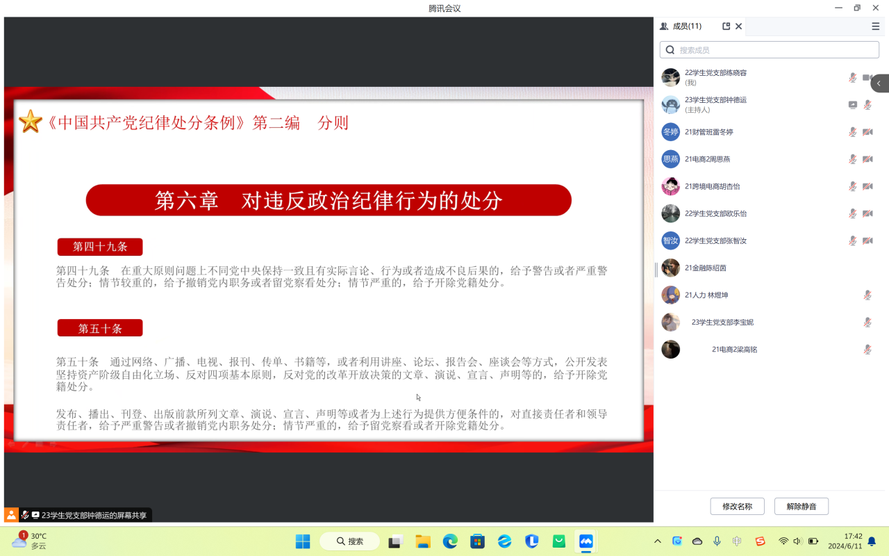 李明璇同志从党面临的形势任务、自身建设和发展历史三个方面,通过案例剖析、视频分享等多种方式深刻解读了开展党纪学习教育的背景;从严明政治纪律和政治规矩、加强全方位管理和经常性监督、引导激励党员干部敢于担当积极作为、坚持党性党风党纪一起抓、促进执纪执法贯通五个方面引导支部党员准确把握《条例》修订的主旨要义。希望支部党员同志能进一步强化党员意识、组织意识,做到学纪、知纪、明纪、守纪,把党的纪律内化为日用而不觉的言行准绳争做新时代硬核共产党员。