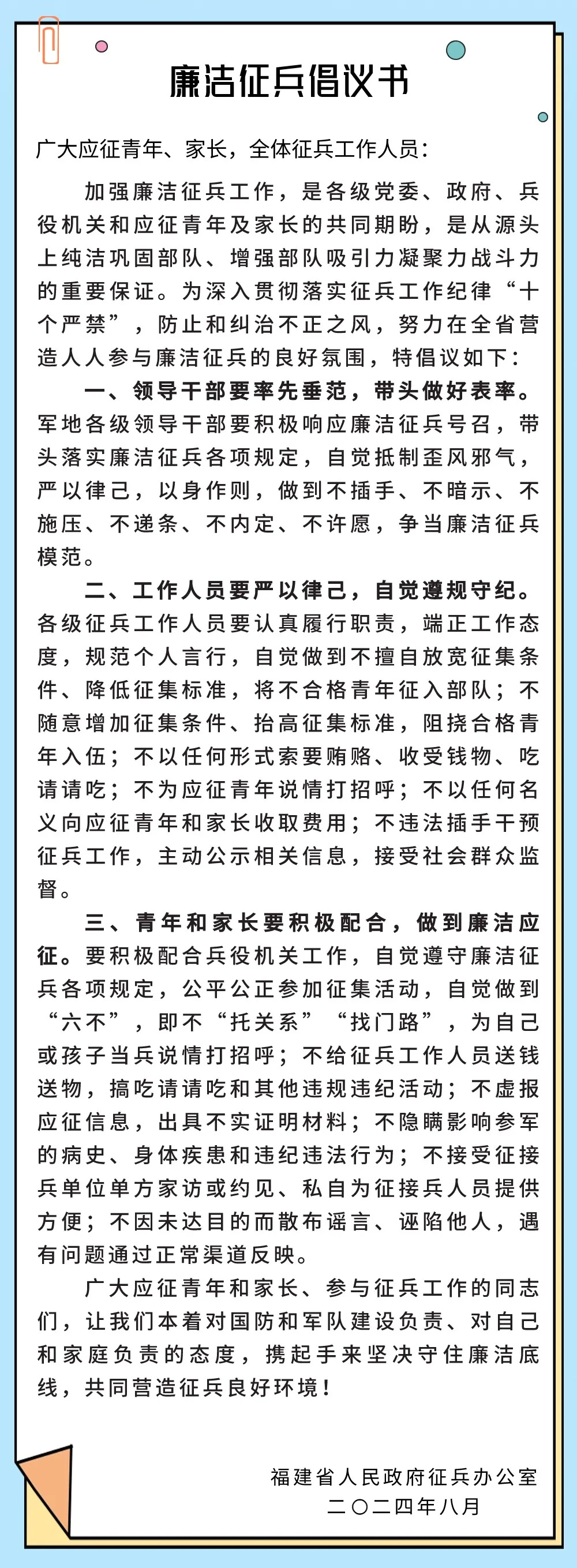 福建省廉洁征兵公告