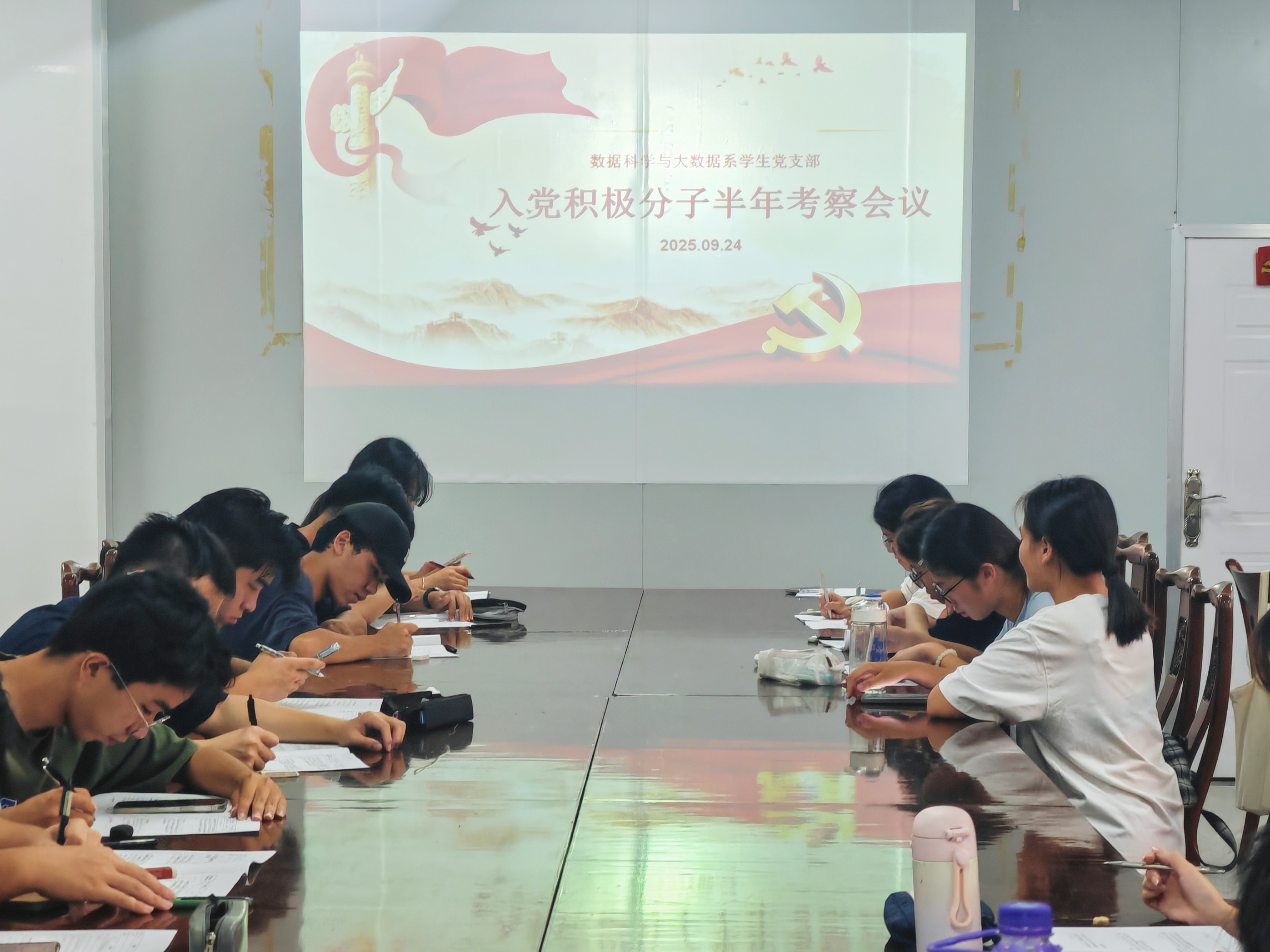2025年9月24日,数据科学与大数据系学生党支部于泽钏楼四楼会议室开展入党积极分子半年考察会议暨主题教育专题党课。党支部书记庄秋荣老师等15名党员及25名入党积极分子参与此次大会。