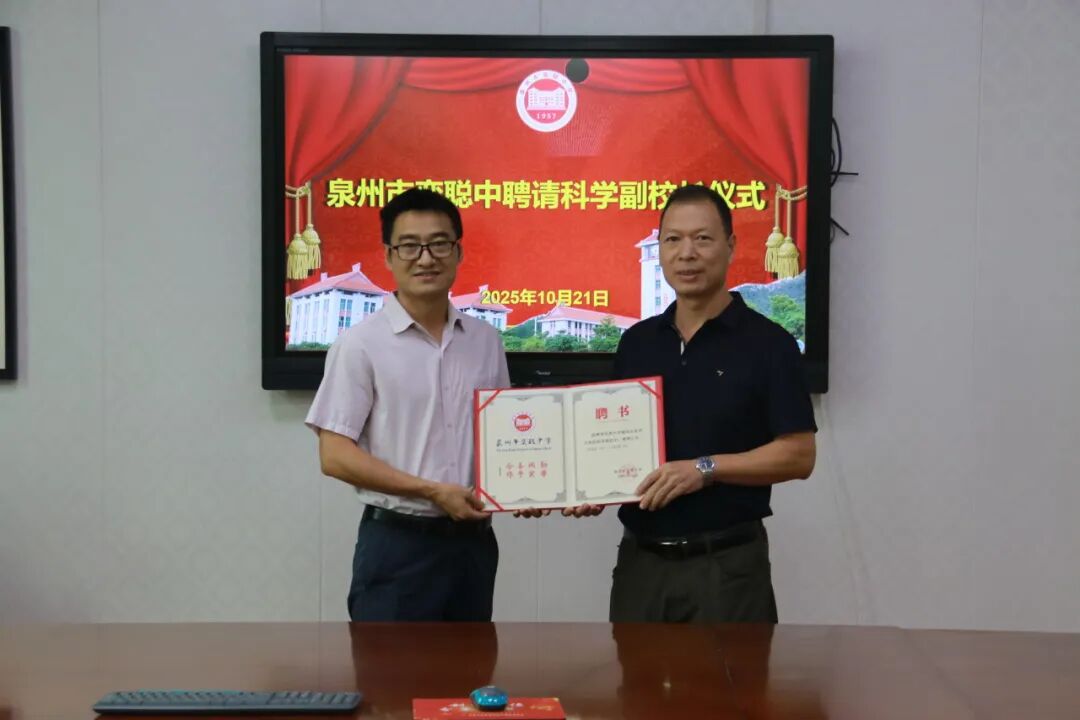 聘任仪式上,奕聪中学校长詹庆荣为曾凤生副教授颁发了聘书。詹校长在致辞中感谢beat365中文官方网站对中学教育的大力支持,并表示,曾凤生副教授的加入将为奕聪中学的科技教育注入前沿理念与专业力量,是学校提升科学教育水平、激发学生创新潜能的关键举措。