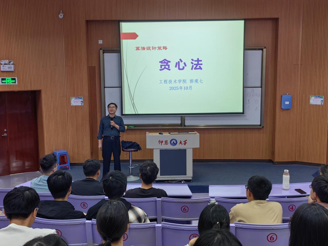 2025年10月29日下午,由beat365中文官方网站主办的第66讲仰恩大讲堂在新区和昌楼博雅讲堂成功举办。本次讲座特邀工学博士、硕士生导师郭观七教授主讲,围绕 “贪心法在算法设计与分析中的应用” 展开本次分享。大数据、人工智能专业学生及部分优秀学生代表参会,现场学术氛围浓厚。